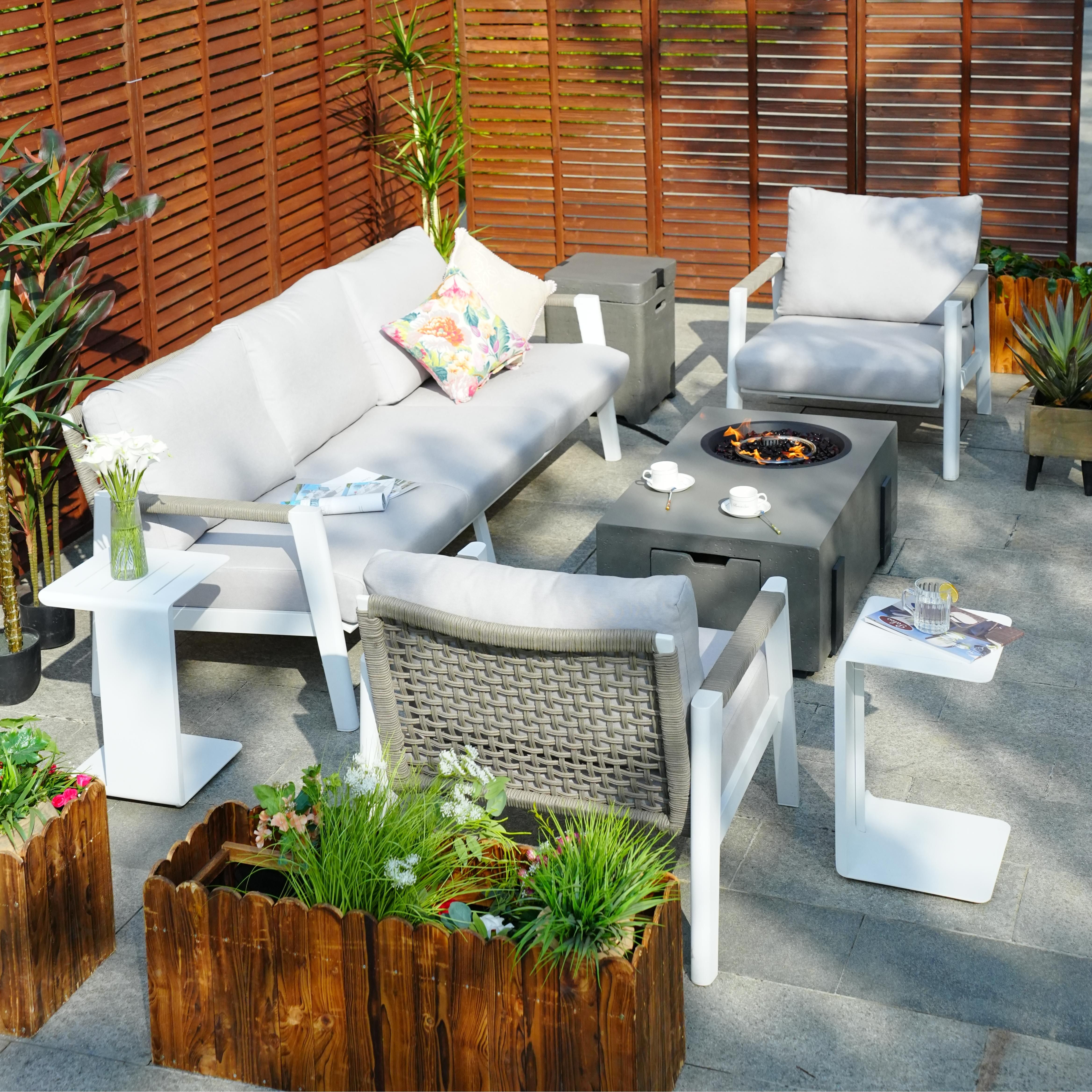 2.Comprehensive Seating Solution: The set includes two single chairs, a 3-seater sofa, a rectangular firepit with a gas tank (side table), and two side tables, ensuring comfort and convenience for small or large gatherings.