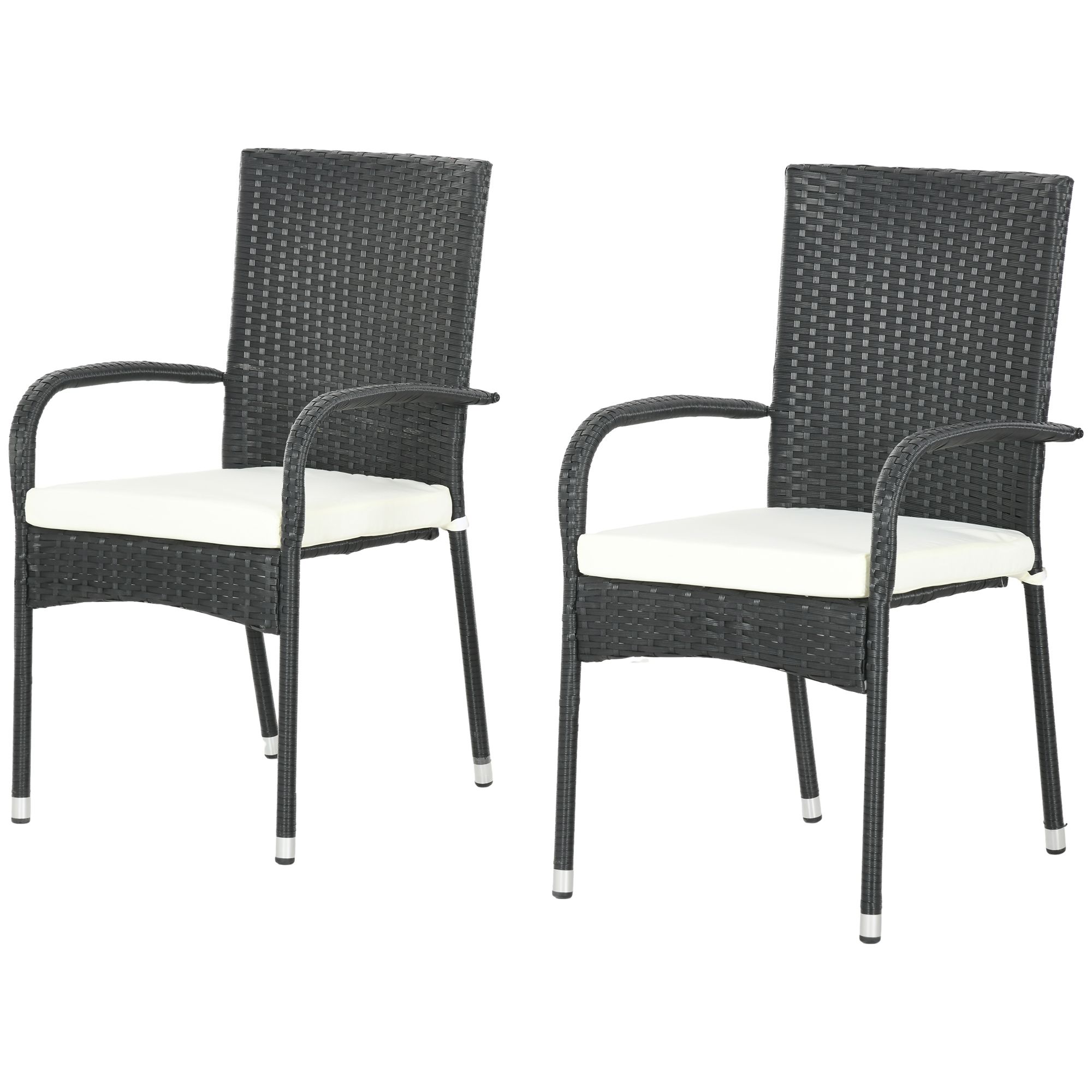 Outsunny's stackable rattan garden chair set blends practicality with aesthetics. Handwoven with PE wicker and reinforced with strong steel frames featuring a powder coat, they endure outdoor conditions and function as an easy accent piece. These patio dining chairs come to you comfortably cushioned, including high backs and armrests on the sides. Stack each chair up and you have the option for an open floor plan. Get out and get comfy with an Outsunny outdoor dining chair set.