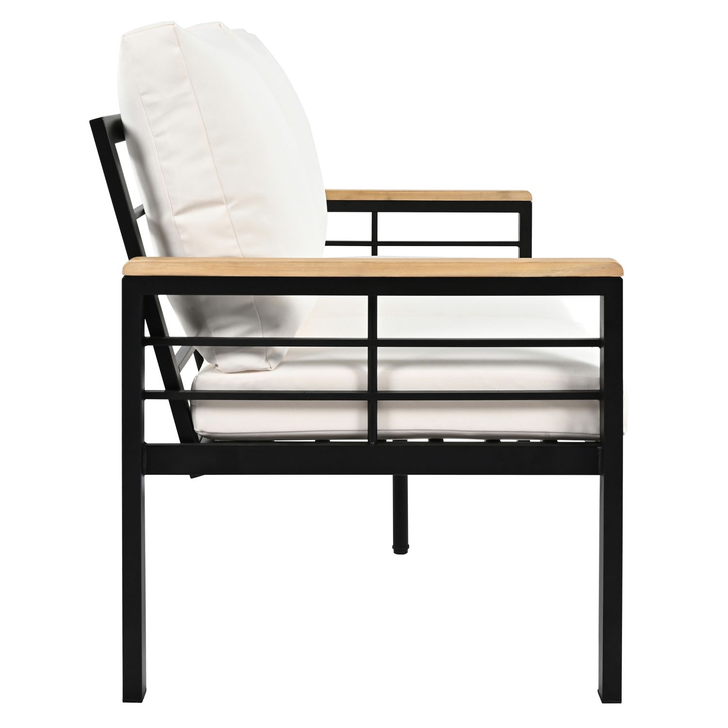 5-Piece Patio Furniture Set: This outdoor furniture set includes 1 table, 1 3-Seat sofa, 2 armchairs, and 1 bench—ideal for 6-8 guests. The sturdy iron frame paired with a solid wood structure ensures enhanced stability and a stylish appearance. The slatted wood tabletop adds rustic charm, combining durability with a timeless aesthetic.