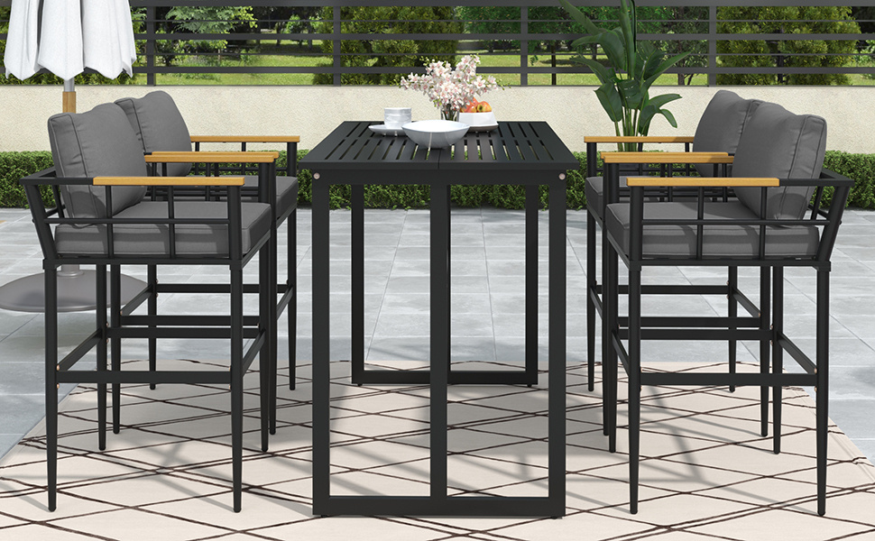 [Classic Material Combination]: The outdoor dining set features a sturdy iron frame paired with natural acacia wood armrests, blending modern aesthetics with natural charm. Its design effortlessly infuses an elegant touch into gardens, patios, or terraces, making it a striking focal point for any outdoor space.