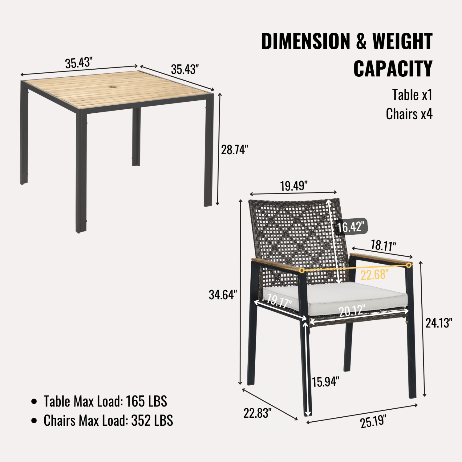 MODERN SET IN COZY HOME: Versatile and stylish Dining patio furniture set, designed to elevate your outdoor living space with comfort and elegance. Crafted from high-quality PE rattan, powder coating frame with solid acacia wood, this set combines durability with a sleek aesthetic, perfect for any patio, balcony, porch, garden, backyard and lawn.