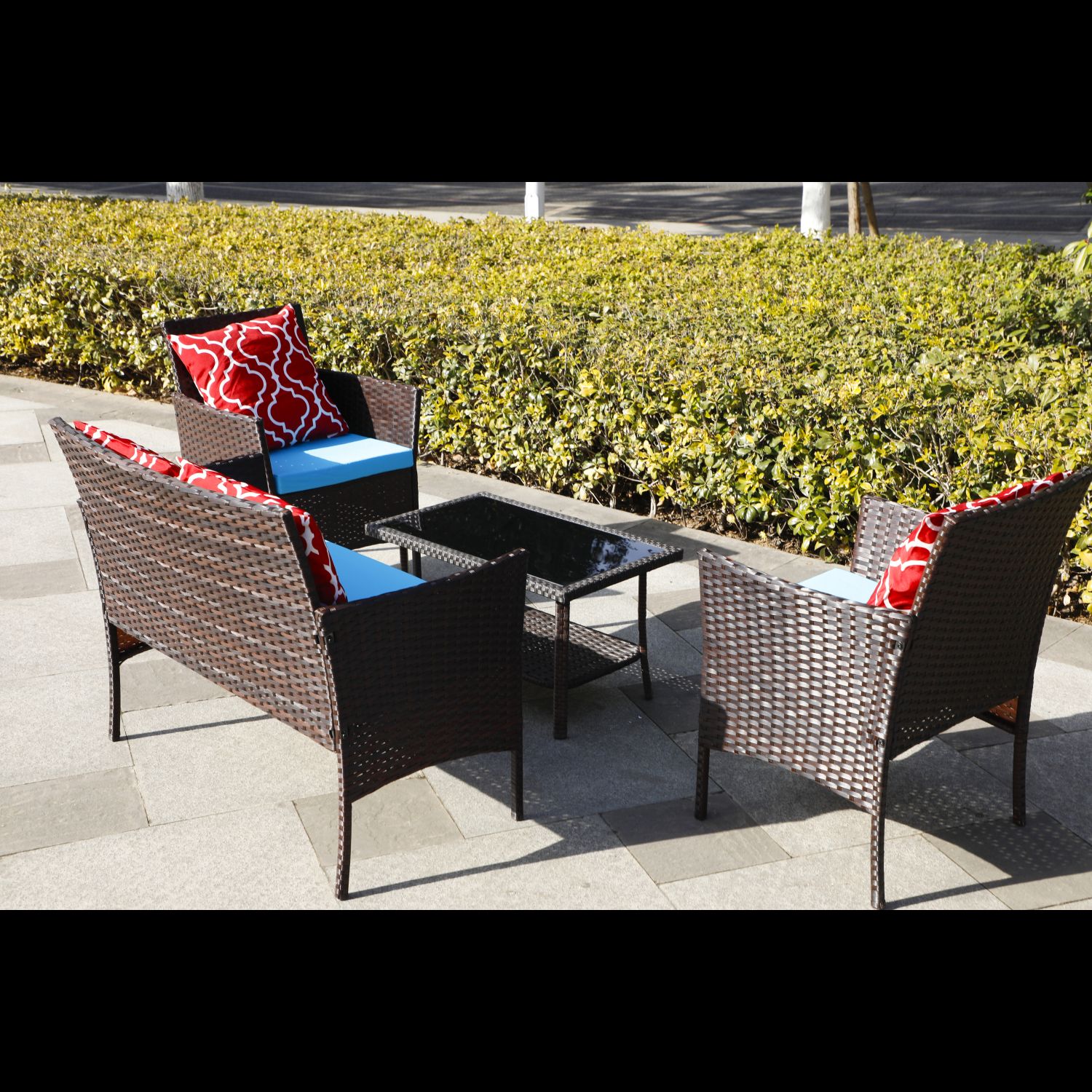 PE flat rattan 9X1, 1MM, galvanized iron pipe 15*15*0.7 pipe, 170g polyester cloth, 5cm seat cushion, 1200g upright cotton, black silk screen tempered glass, four red and white checkered pillows ! Four-Piece Sofa Set Table With Sofa Chair PE Rattan Outdoor Furniture With Sapphire Blue Color Cushion