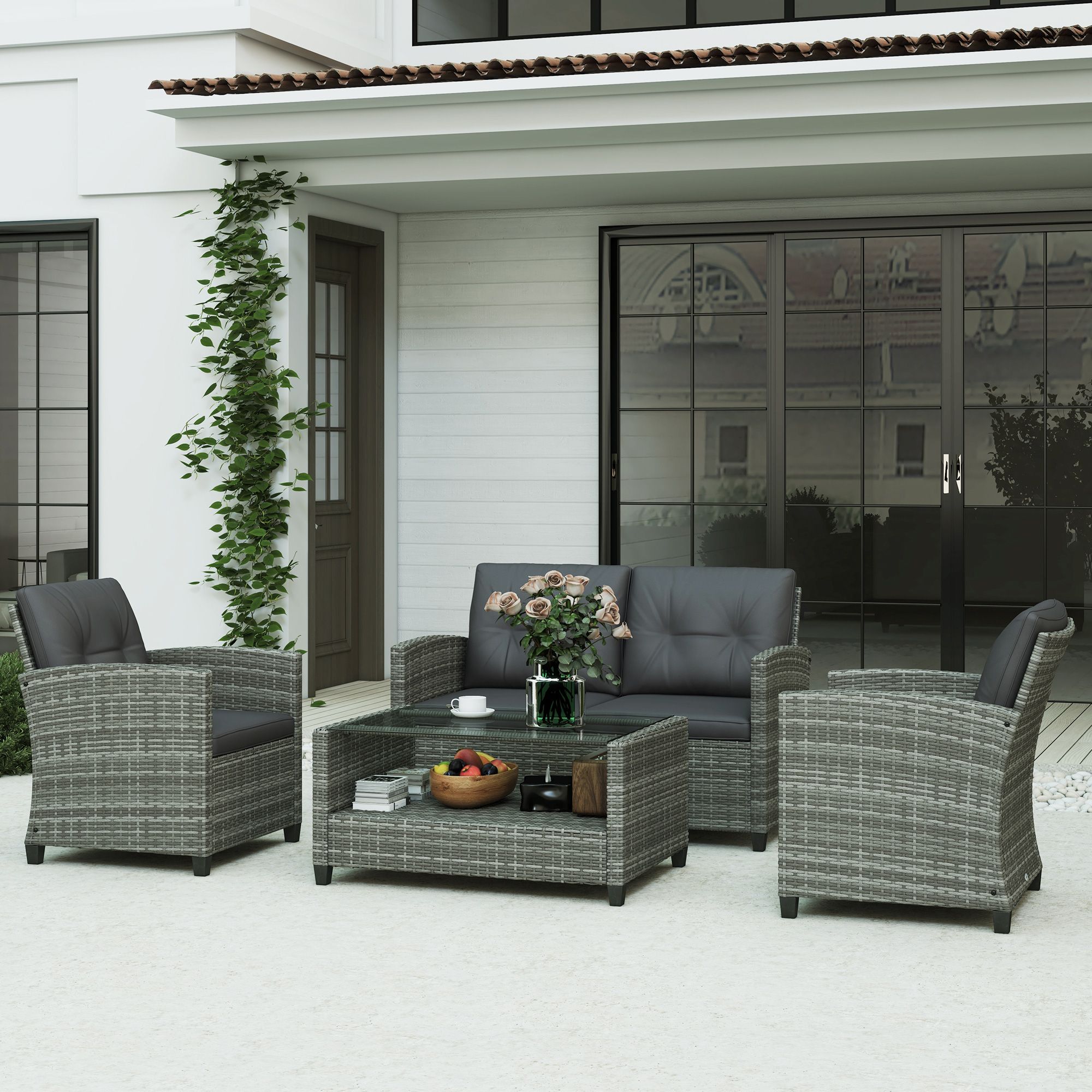 Our 4-piece patio furniture set brings indoor comfort to your backyard. Everything is there: a loveseat, two armchairs, and a two-tier coffee table. Enjoy the perks of home, like tilted tufted backrest cushions, a place to put drinks, and softly padded seats in the great outdoors. Always have room for surprise guests, and spend more time outside. Our PE wicker patio furniture was handwoven, offering a classic rattan style with all-weather resistance. Get out, get comfy, and get Outsunny.
