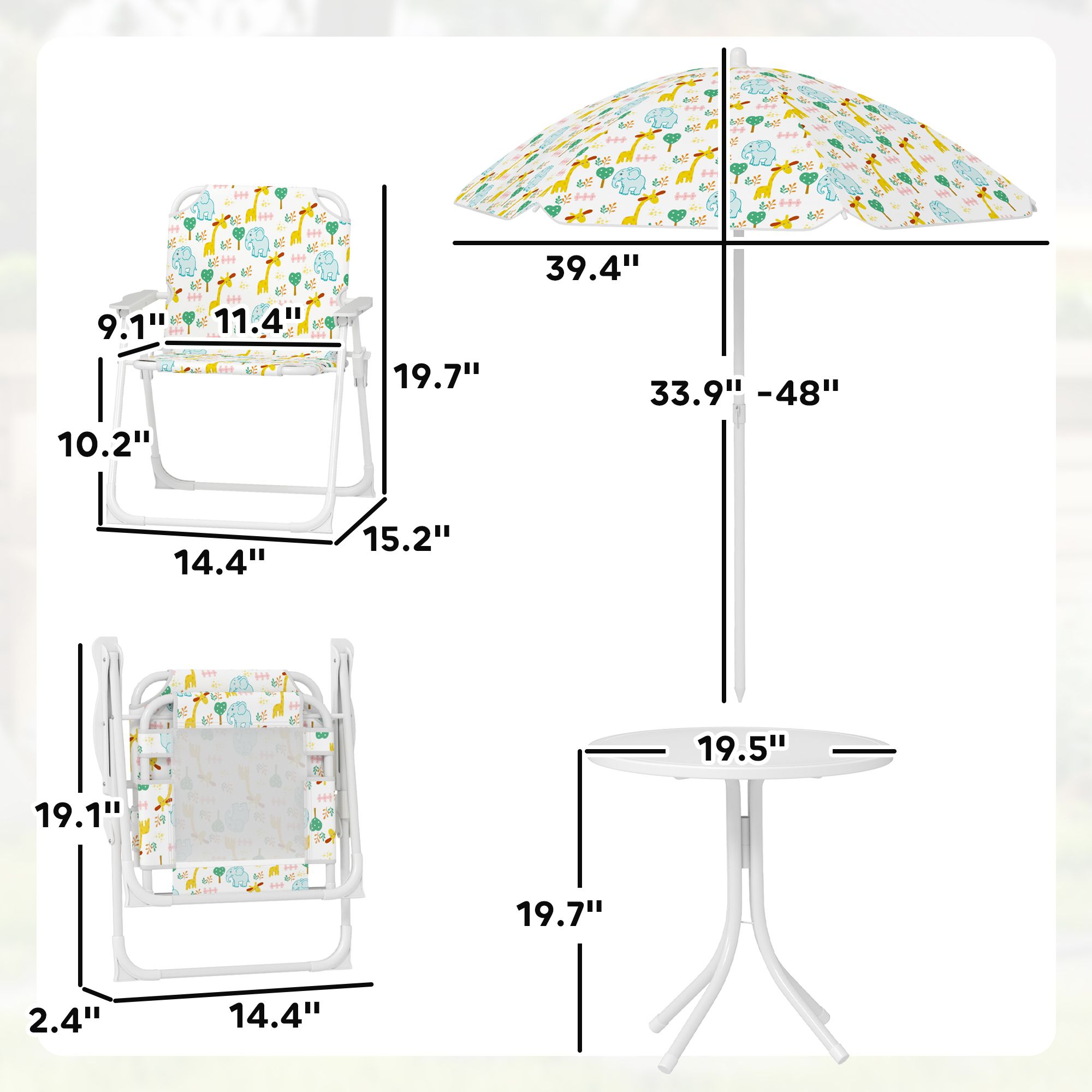 1.- Playful Garden Set: This kid's picnic table and chair set includes two folding chairs, a round table, and a height-adjustable umbrella with a cute elephant and giraffe pattern, creating a setup for outdoor play dates, picnics, or garden fun.