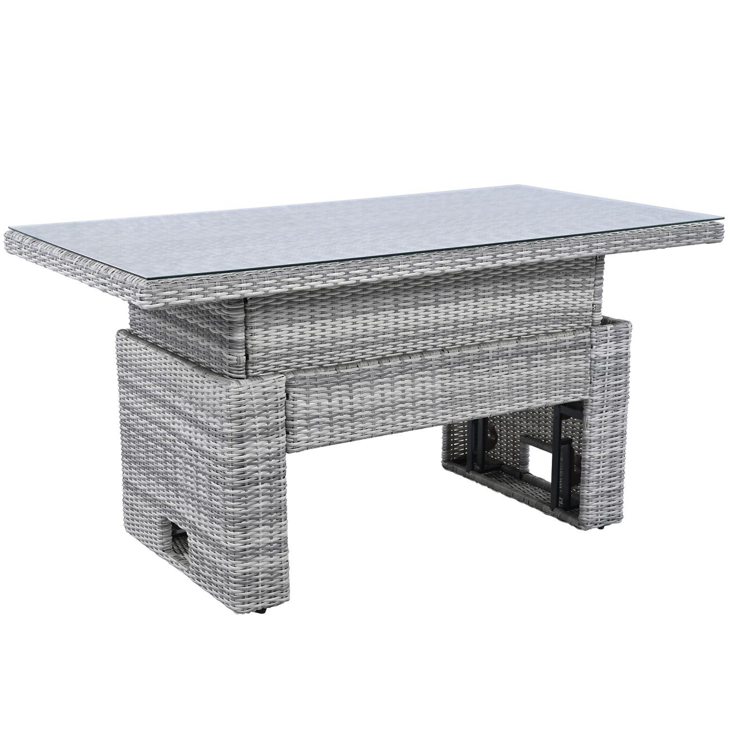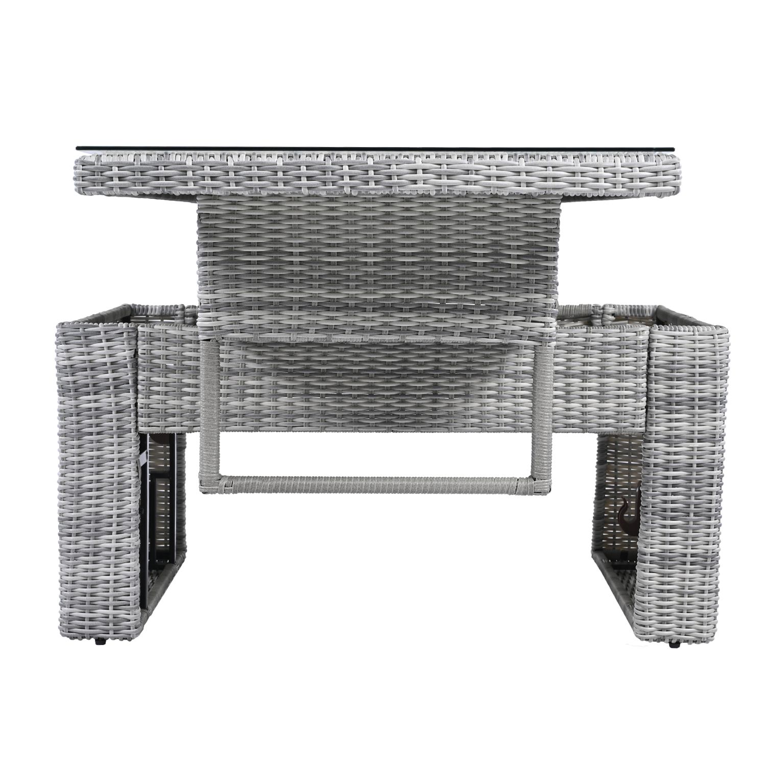 Adjustable Table – This outdoor sofa set features a versatile adjustable-height table with a durable tempered glass top. Easily adjustable to two different heights, it accommodates a variety of activities, whether you're dining, working, or relaxing with drinks. The tempered glass is not only highly durable and resistant to impact and scratches but also easy to maintain. The sleek glass surface and sturdy frame bring a modern, stylish touch, seamlessly enhancing any outdoor space.