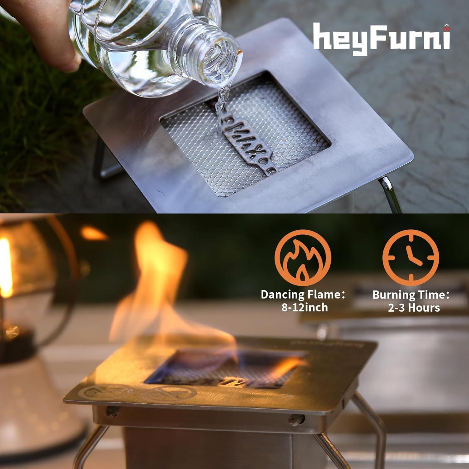 This premium table top fireplace especially for indoor living room, outdoor patio table taliking. The outer frame of the fireplace is made of non curable 430 stainless steel and has a super fine matte black powder coated heat resistant surface that gives it a stunning look and makes it extremely durable.The good helper for winter heating, have surprised a number of friends with the table top fire, a conversation starter.Features:High quality stainless steel and powder-coated frame for outdoor use.Bio ethanol fireplace creates the real dancing flames. High fence style guard keeps the scarf and keeps the wind when set patio.Includes a powerful heater that can accommodate a room up to 250 square feet.Green, environmentally friendly use bio ethanol can heat as fuel.Ventilation free: The ventilation unit without ventilation requires no use of electricity, gas, chimney, vent or gel cans.Specifications:Frame material: thermo stable black powder coated metal frameBurner material: high quality 430 stainless steel burner frame.Burner frame capacity: 0.3 litres.Burning time: 2 or 3 hours.Whole dimensions: 18 x 18 x 12 cm. 0.3 litre burner capacity takes about 2 or 3 hours per refill and produced.4000 but to heat 215sqft.Flame extinguisher included to stir the fire if necessary.Silicone regulator included to easily add ethanol fuel.TIP: Do not add ethanol during the burning process.Do not use the fire to heat or boil water or as a cooking device.Do not put charcoal, paper, wood or other flammable objects in the fire.